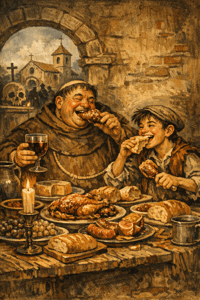 “…’Mira, mozo, los sacerdotes han de ser muy templados en su comer y beber, y por esto yo no me desmando como otros’. Mas el lacerado mentía falsamente, porque en cofradías y mortuorios que rezamos, a costa ajena comía como lobo y bebía más que un saludador.»